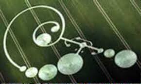 Foto cedida por circlemakers.org Esta formação foi descoberta em Eastfield, Inglaterra, em junho de 2004. Um artigo da Western Daily Press chamou o desenho de "sinistramente semelhante a esboços de uma das antigas peças de equipamento de Nikola Tesla". |